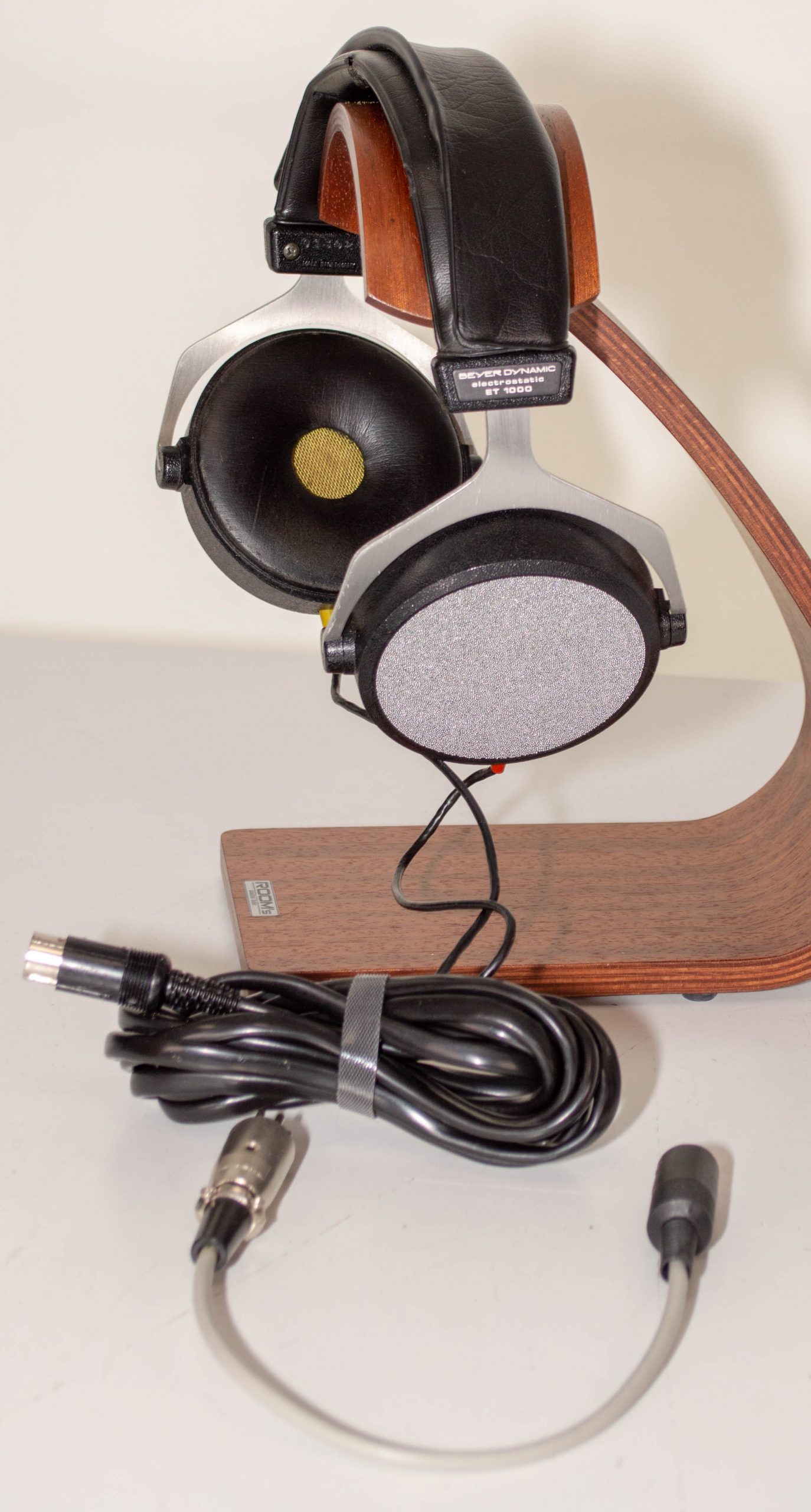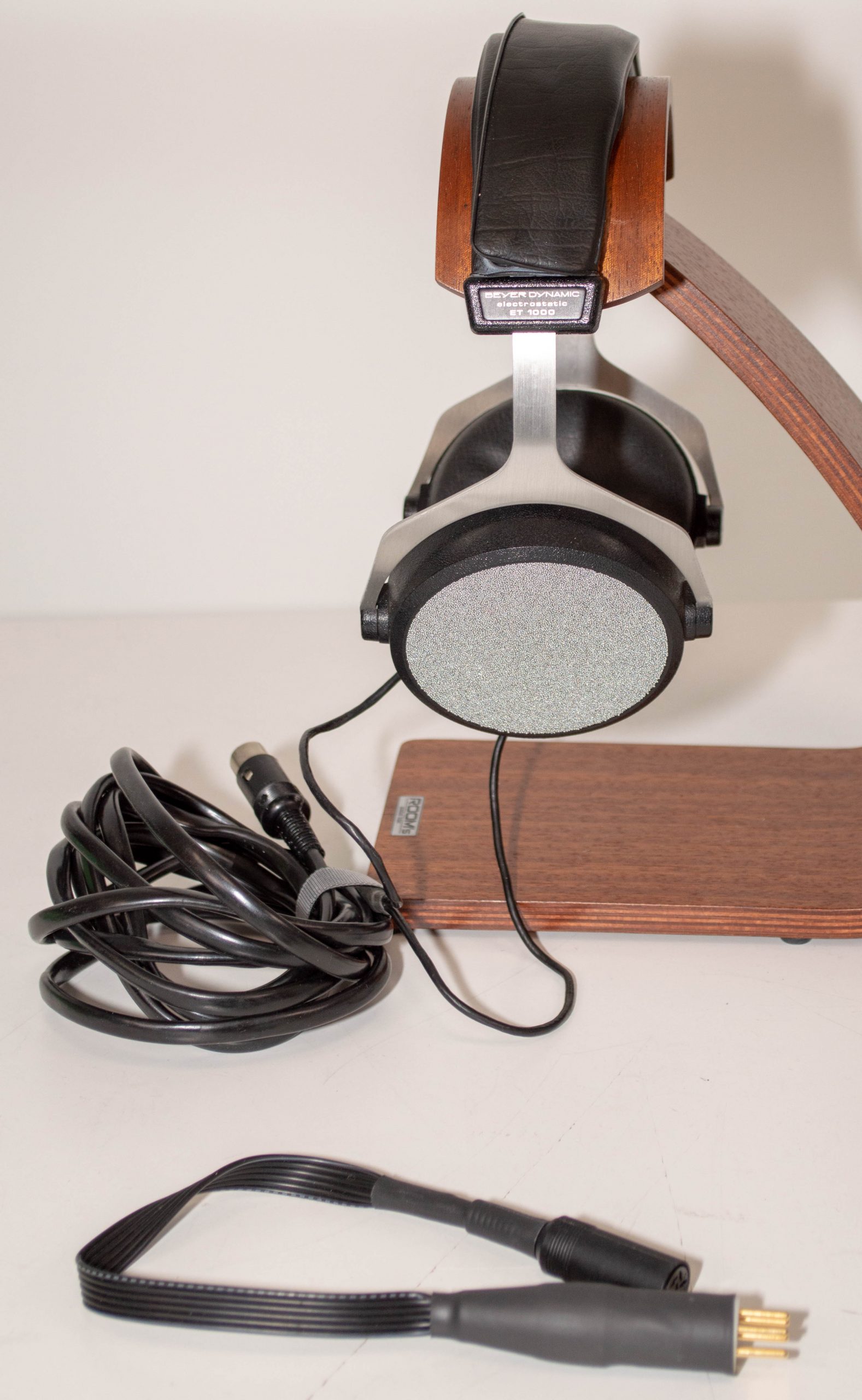 The legendary Beyerdynamic ET1000, on of the best headphones of this generation. Great sounding units when properly driven and surprisingly comfortable. These require a bias voltage of 180V but they work just fine off Stax normal bias outputs. An adapter to do just that is included with the headphones.