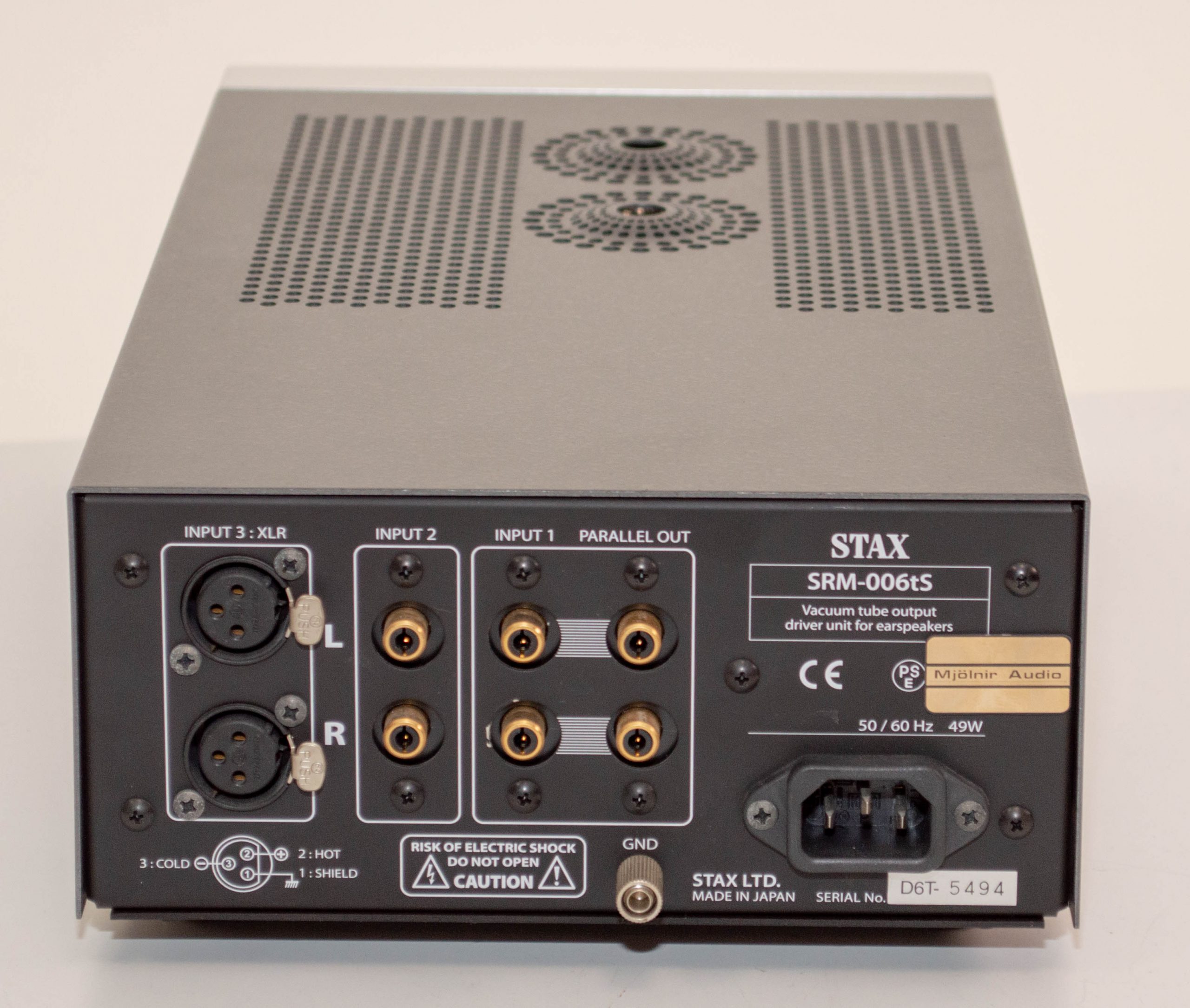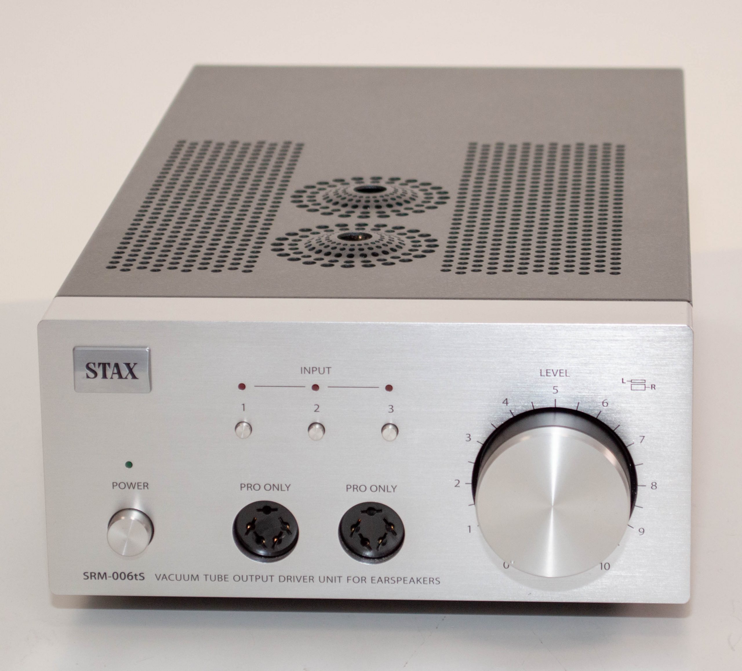 This one is bit of a rarity, as it is the 006t but with three Pro bias outputs.  Stax only made these for just over a year as they discontinued support for the Normal bias sets but the new 006tA wasn’t quite ready.  Their solution, just add the third Pro bias socket and the amp is now a bit odd.  🙂  Same performance and with the CCS mod, this amp can actually drive three sets at the same time.