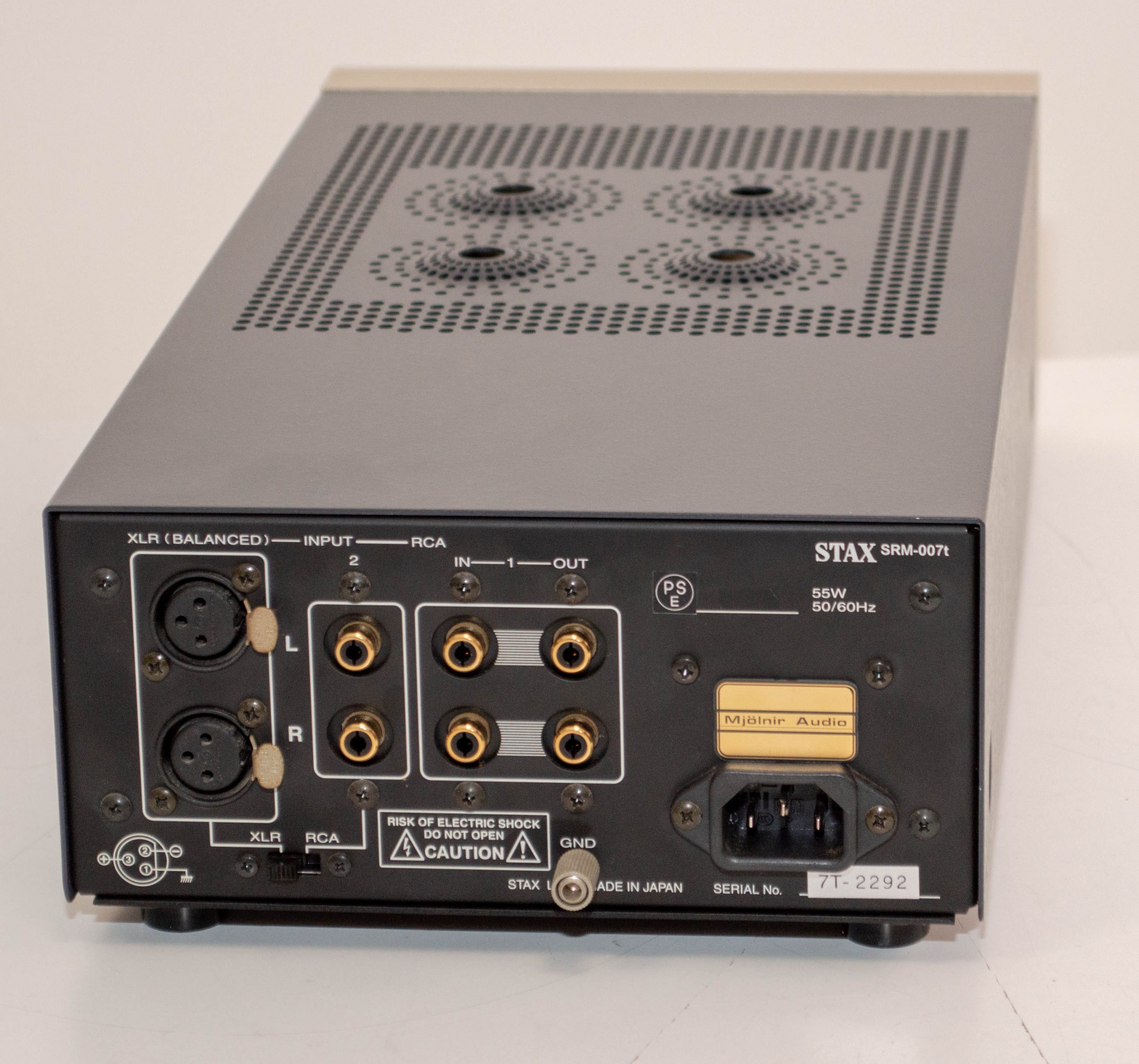 Here is a new Stax SRM-270S amplifier that I bought when they came out and just opened it up to check out the circuitry.  It has next to no hours on it and looks like new, even though my camera simply refused to take a good picture of the front panel.  🙂  This is a Japanese unit but will com with my own upgraded power supplies with either a European or US power plug.  It has the original box, manual and RCA cable.