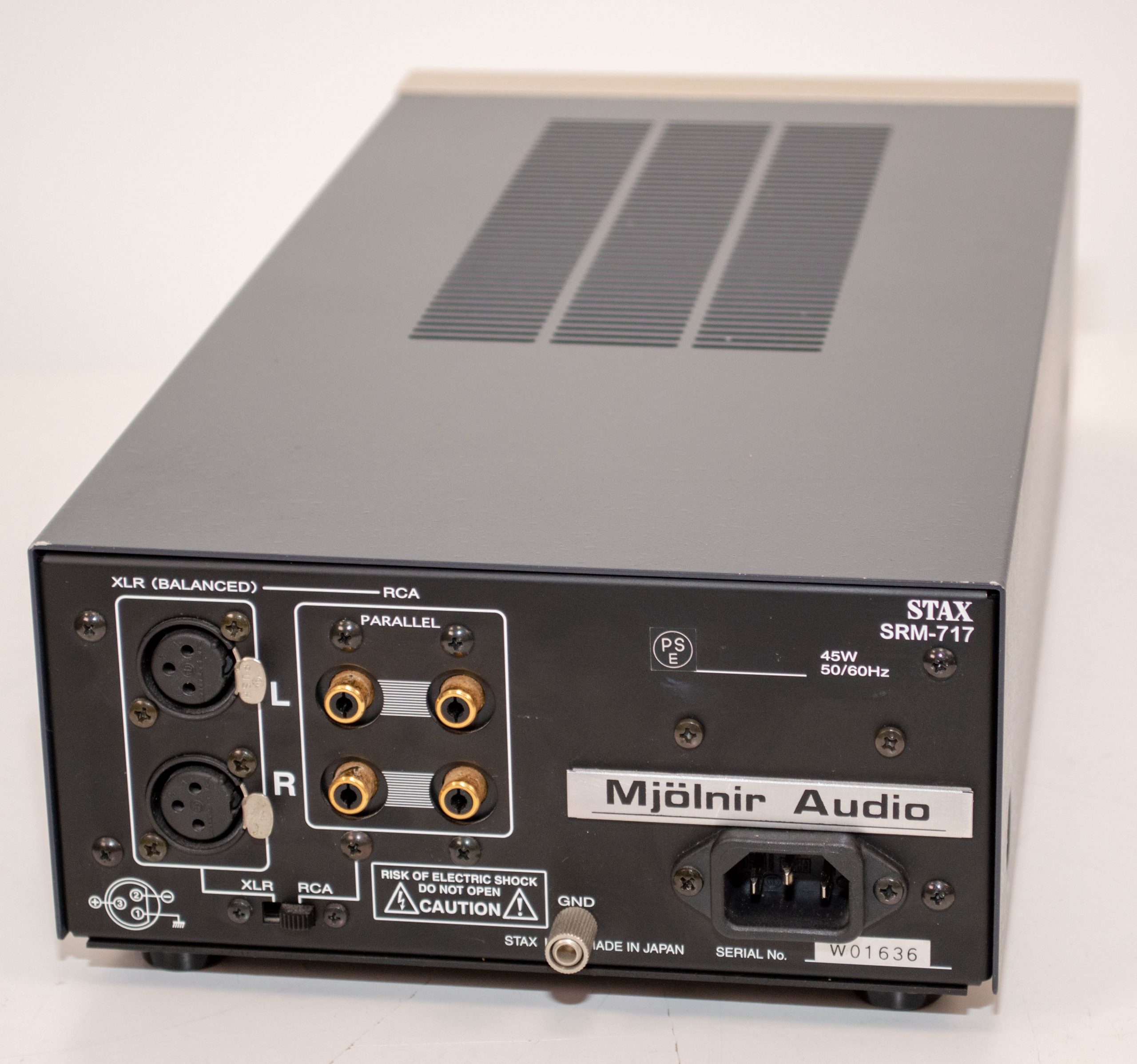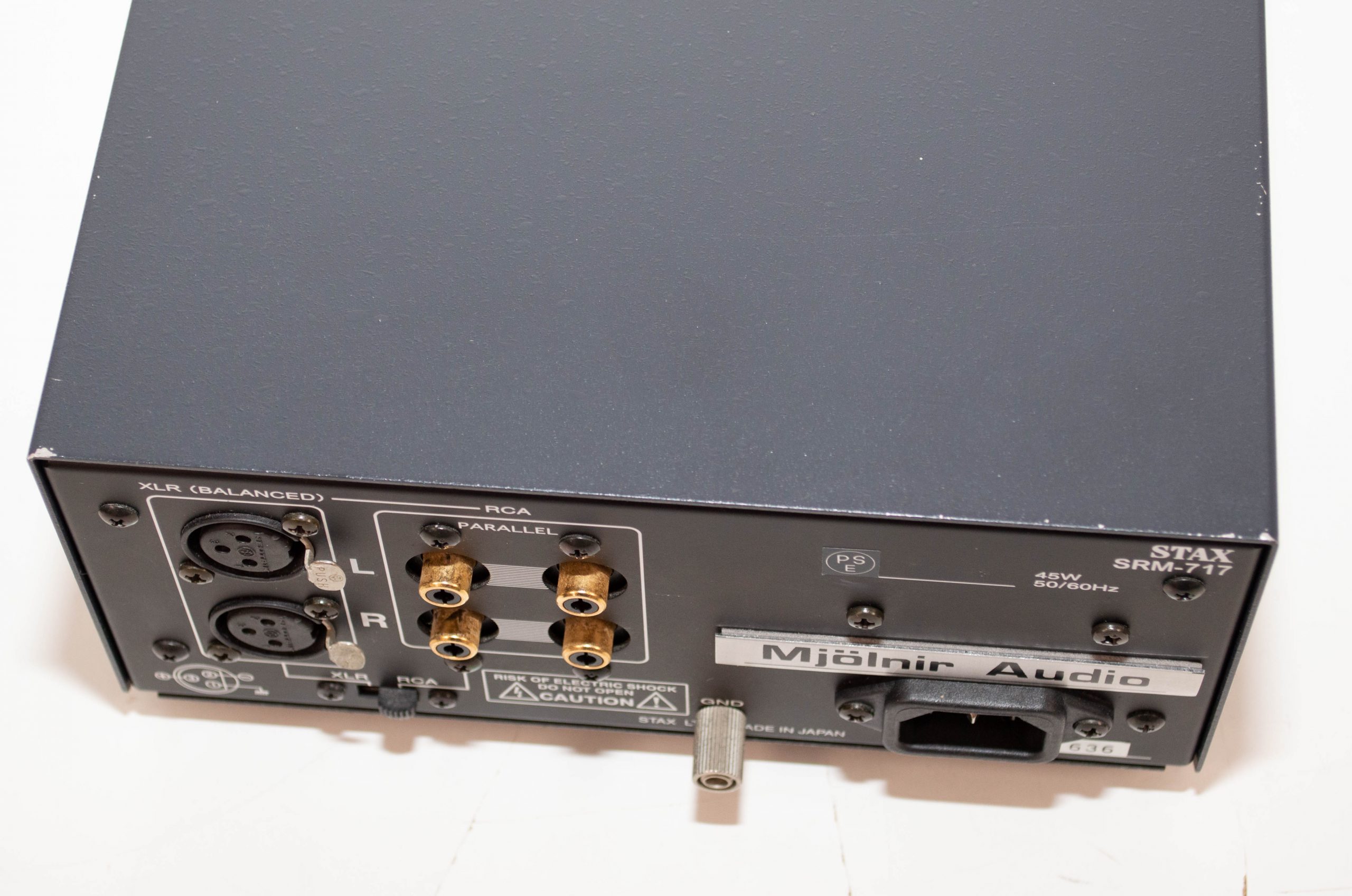 The Stax SRM-717, arguably the best amp they ever made, that I’ve fully modified and refurbished. I’ve cleaned up the output stage, increased the output power and removed the protection stage as it just makes things worse. The end result is a far superior amp to the stock unit with more output power on top. I’ve also replaced all of the electrolytic capacitors so the amp is good for another 20 years of service.